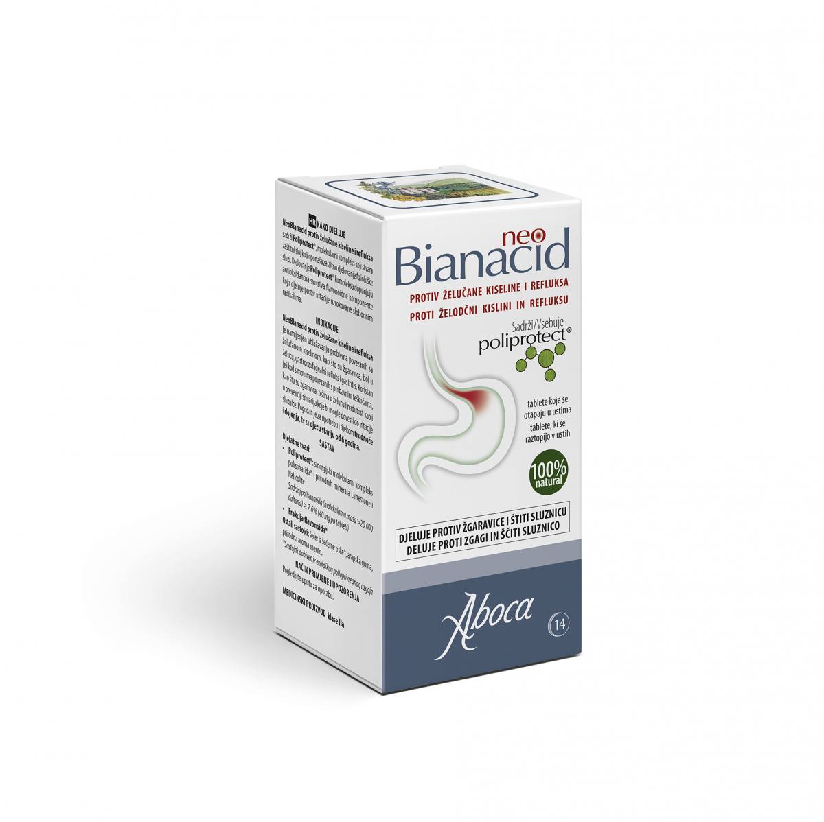 NeoBianacid proti želodčni kislini in refluksu oblikuje oblogo s pregradnim učinkom na sluznici, s čimer jo zaščiti pred stikom z želodčnimi sokovi in dražečimi snovmi. NeoBianacid proti želodčni kislini in refluksu vsebuje Poliprotect®, molekularni kompleks, plod raziskav podjetja Aboca, ki zahvaljujoč svojim mukoadhezivnim lastnostim poustvari zaščitno delovanje fiziološke sluzi. Delovanje kompleksa Poliprotect® izhaja iz sinergije med polisaharidno komponento (molekulska masa > 20.000 daltonov), ki ima visoko afiniteto za sluznico, in mineralno komponento (Limestone in Nahcolite). Delovanje kompleksa Poliprotect® dopolnjujejo antioksidantne lastnosti flavonoidne komponente, ki deluje proti draženju zaradi prostih radikalov.