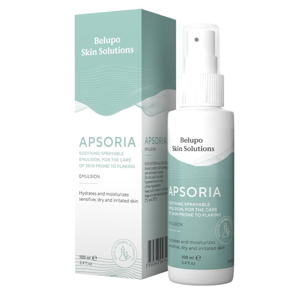 Belupo Skin Solutions Apsoria je pomirjujoča emulzija v spreju, namenjena hidrataciji in vlaženju suhe in razdražene kože, primerna za lasišče in telo.