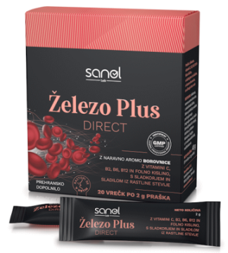 Sanol LAB Železo Plus Direct vsebuje 20 vrečk za uživanje brez vode. Izdelek vsebuje železo, vitamin C, vitamine B2, B6 in B12 ter folno kislino. Je odlična podpora za kri in ima prijeten nekovinski okus z naravno aromo borovnice.
