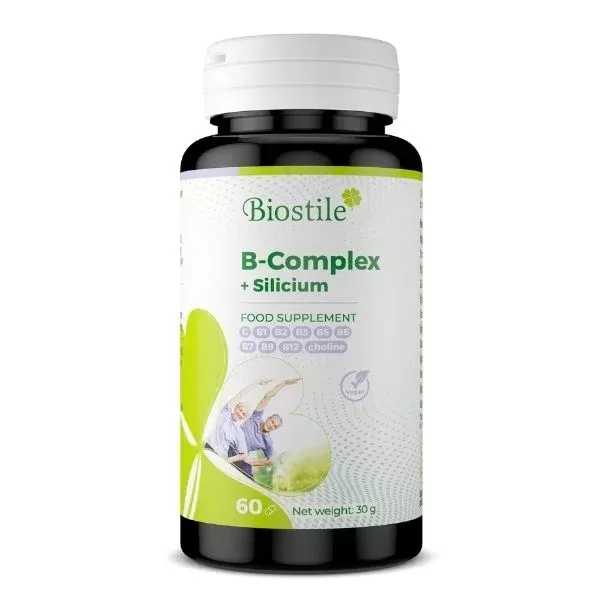 Prehransko dopolnilo B-Complex + Silicium s celotnim spektrom vitaminov B-kompleksa (B1, B2, B3, B5, B6, B7, B9, B12), holinom, ter z organsko vezanim silicijem iz mladih poganjkov bambusa in vitaminom C iz plodov šipka poskrbi za normalno psihološko delovanje, umsko zmogljivost ter zdravo kožo.