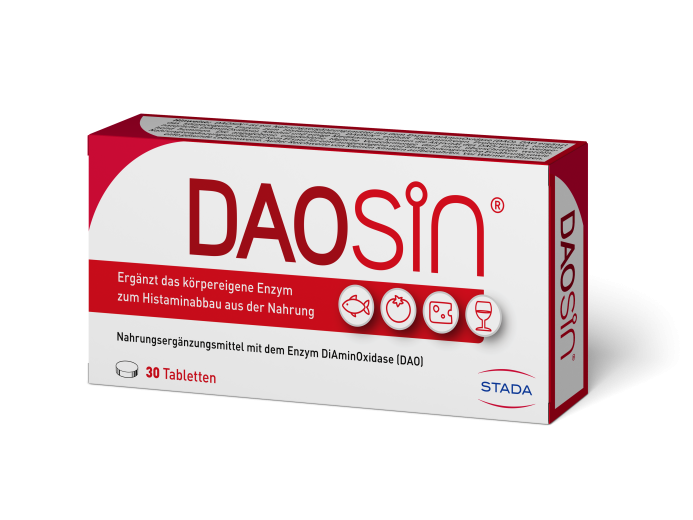 DAOSiN® je prehransko dopolnilo, ki vsebuje diamin oksidazo (DAO) - encim, ki podpira razgradnjo histamina, zaužitega s hrano. DAOSiN® vsebuje brezhistaminski izvleček beljakovin, ki je bogat z naravnim encimom DAO. Alkohol in nekatera zdravila lahko znatno zavirajo aktivnost encima DAO. Priporočene dnevne količine oziroma odmerka se ne sme prekoračiti. Prehransko dopolnilo ni nadomestilo za uravnoteženo in raznovrstno prehrano in zdrav življenjski slog. Shranjevati nedosegljivo otrokom! Shranjujte zaščiteno pred toploto.