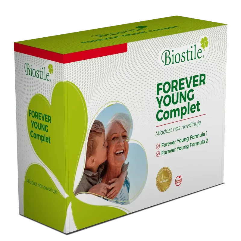 Vrhunski paket prehranskih dopolnil Forever young , sestavljen iz dveh komplementarnih formul, razvitih s pomočjo dr. Majića. Za 30 dni podpore. Vsebuje ginseng in vitamine B1, B2, B3. Formula 1 vsebuje ginseng, ki prispeva k spodbujanju vitalnosti1 in normalnemu delovanju imunskega sistema4. Ginseng podpira tudi delovanje spomina in pripomore k dobri kognitivni zmogljivosti2. Formula 1 vsebuje tudi magnezij, ki prispeva k zmanjšanju utrujenosti, delovanju mišic ter ohranjanju zdravih kosti in zob. Formula 2 vsebuje vitamin B1, ki pripomore k normalnemu psihološkemu delovanju in ima vlogo pri delovanju srca. V njej najdemo tudi vitamina B2 in B3, ki med drugim prispevata k delovanju živčnega sistema in ohranjanju zdrave kože in sluznic.