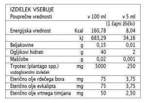 Sestavine: demineralizirana voda; fruktoza; zgoščen pomarančni sok; trpotec (Plantago spp.), vodnoglicerolni izvleček; konzervans: kalijev sorbat; eterično olje rdečega bora (Pinus spp.), eterično olje evkalipta (Eucaliptus globulus); eterično olje vrtnega timijana (Thymus vulgaris).