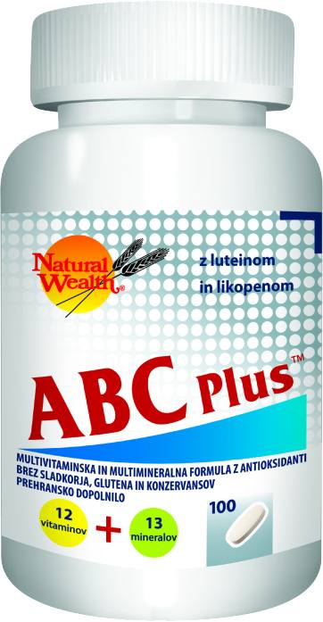 Prehransko dopolnilo v obliki tablet Natural Wealth® ABC PLUS vsebuje multivitamine in multiminerale z antioksidanti: 12 vitaminov in 12 mineralov, z luteinom in likopenom.