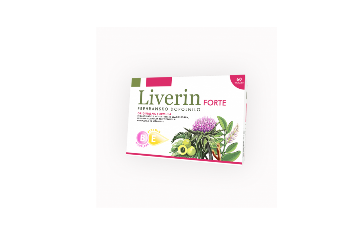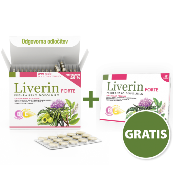 LIVERIN FORTE vsebuje rastlinske izvlečke pegastega badlja, golostebelnega sladkega korena in indijske kosmulje, ter vitamine B kompleksa in vitamin E. Na voljo tudi v pakiranju po 240 tablet.