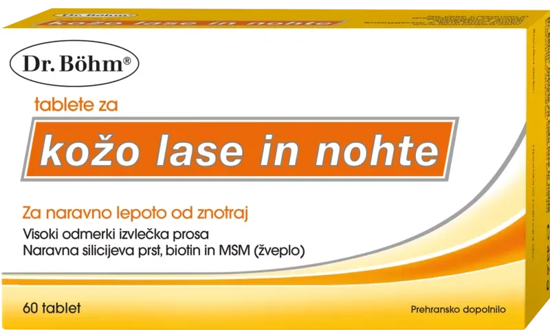Dr. Böhm Tablete za kožo, lase in nohte podpirajo lepoto od znotraj. Biotin in cink prispevata k ohranjanju zdravih las in kože. Poleg tega prispevata selen in cink k ohranjanju zdravih nohtov. Tablete vsebujejo tudi silicijevo prst in visokokakovostni izvleček prosa, ki sta bogata s silicijem - ključno sestavino vseh celic kože, las in nohtov.