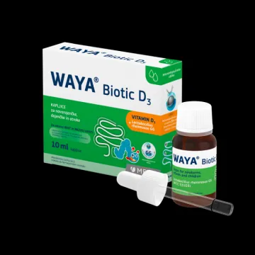 Prehransko dopolnilo v obliki kapljic WAYA® Biotic D3 z dobrimi mlečnokislinskimi bakterijami poskrbi za udobje črevesja in za ustrezen dnevni vnos vitamina D3 pri najmlajših, ki je potreben za normalno rast in razvoj kosti ter ima vlogo pri delovanju imunskega sistema.