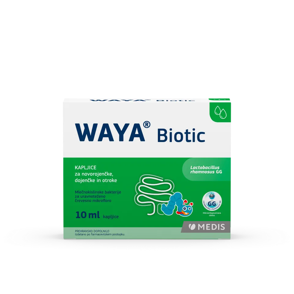 WAYA® Biotic kapljice edine vsebujejo mikroenkapsulirani sev mlečnokislinskih bakterij Lactobacillus rhamnosus GG, ki dopolnjujejo črevesno mikrobioto.