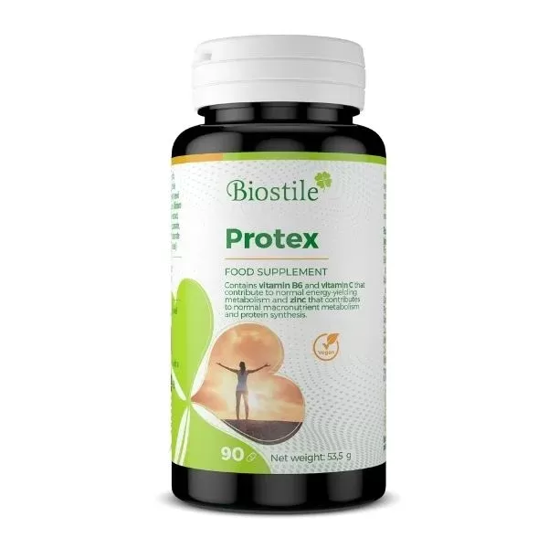 Protex kapsule z izvlečki naravnih zelišč. Izdelek vsebuje vitamina B6 in C, ki prispevata k sproščanju energije pri presnovi ter cink, ki ima vlogo pri presnovi makrohranil in sintezi beljakovin.