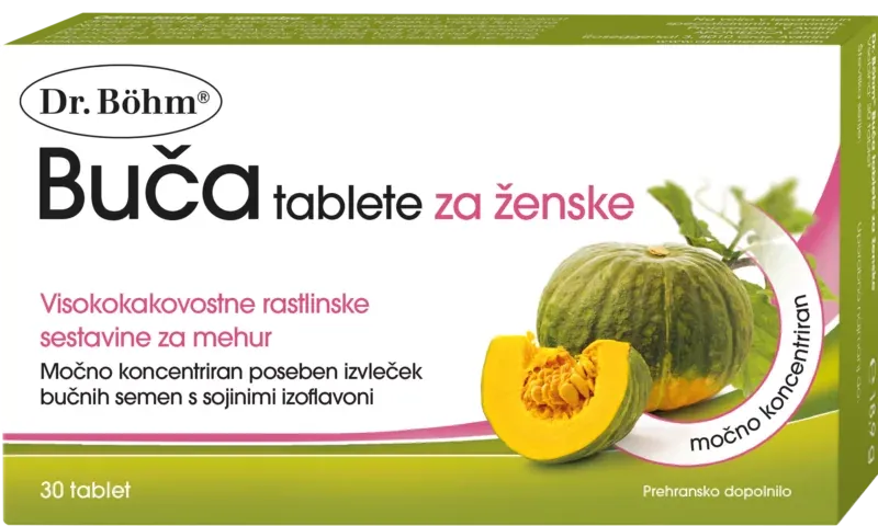 Pozitivni učinek bučnih semen na mehur je znan že več stoletij. Prehransko dopolnilo Dr. Böhm® Buča tablete za ženske vsebuje poseben izvleček semen štajerske buče, ki s posebnimi vodotopnimi sestavinami podpira delovanje mehurja. Nahajajo se v delu brez maščobe in ne v olju bučnih semen. Za doseganje polnega učinka sestavin iz visokokakovostnih bučnih semen je potrebno ustrezno odmerjanje. S pomočjo patentiranega postopka proizvodnje so samo v prehranskem dopolnilu Dr. Böhm® Buča tablete za ženske prav te dragocene snovi brez olja več kot dvajsetkrat koncentrirane. Tabletam so dodani tudi dragoceni sojini izoflavoni (brez gensko spremenjene tehnologije)