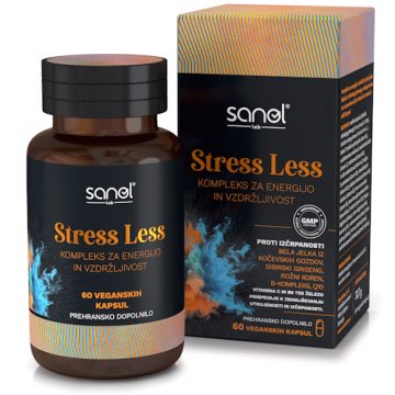 Sanol LAB Stress Less 60 veganskih kapsul za energijo, ki premaga stres, utrujenost in izčrpanost, z belo jelko Belinal®, sibirskim ginsengom, rožnim korenom, B-kompleksom, koencimom Q10 in drugimi vitamini ter minerali.