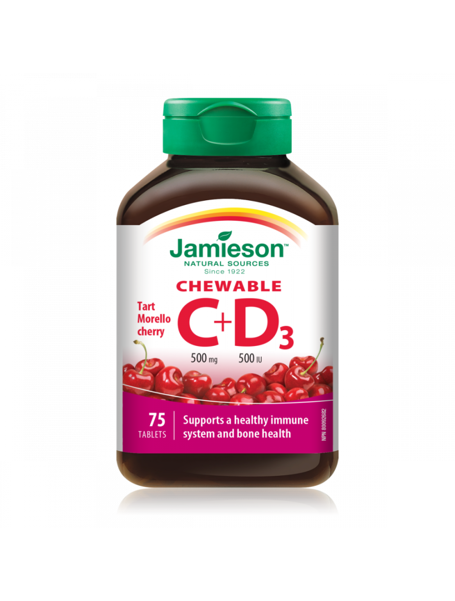 Jamieson Vitamin C+D žvečljive tablete z naravnim okusom češnje je prehransko dopolnilo za podporo imunskemu sistemu.