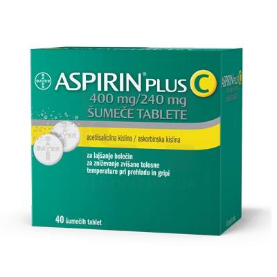 Kaj vsebuje zdravilo Aspirin plus C: Ena šumeča tableta vsebuje 400 mg acetilsalicilne kisline in 240 mg askorbinske kisline.